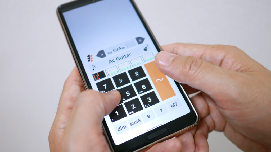 KANTAN Musicは、作曲の学習やジャズの楽譜などで用いられる度数表記(ディグリー)を元にしているので、音楽を学んだことのある人なら楽譜が無くてもすぐに演奏できます。